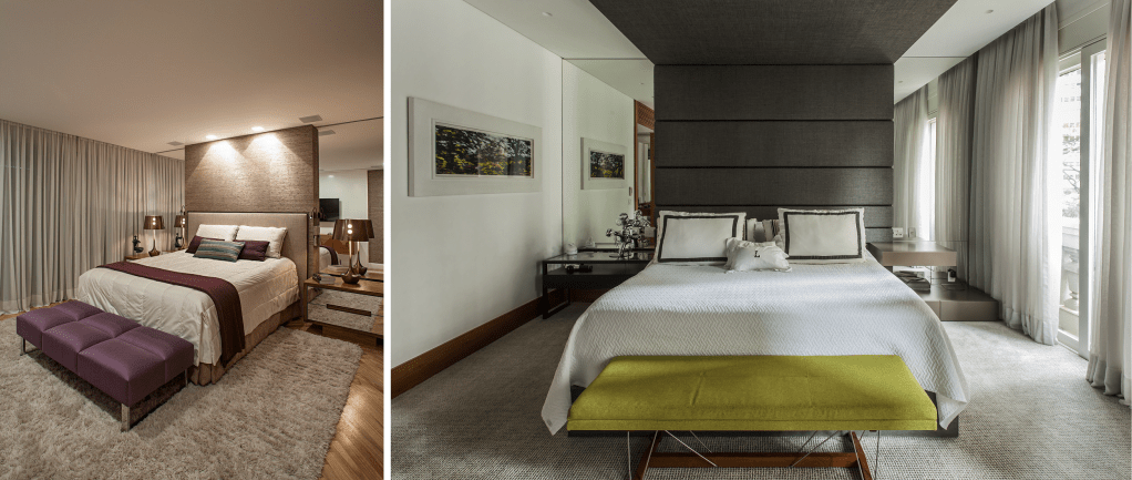 Por exemplo, aos pés da cama, o ideal é que o recamier ou banco seja da mesma largura do móvel para não atrapalhar a circulação.