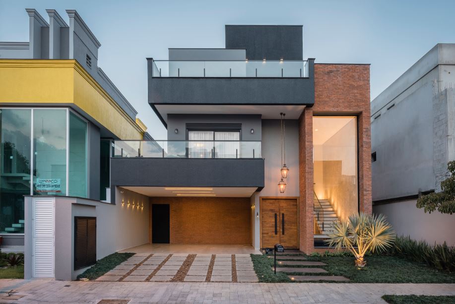Na fachada da residência, localizada em um condomínio de fechado, a dupla do PB Arquitetura investiu na elegância do grafite eleito para as sacadas. O tom discreto promove uma elegante associação com a rusticidade do tijolinho que emoldura a ‘caixa envidraçada’ que abre a visão da escada interna | Foto: Henrique Ribeiro