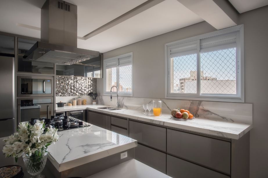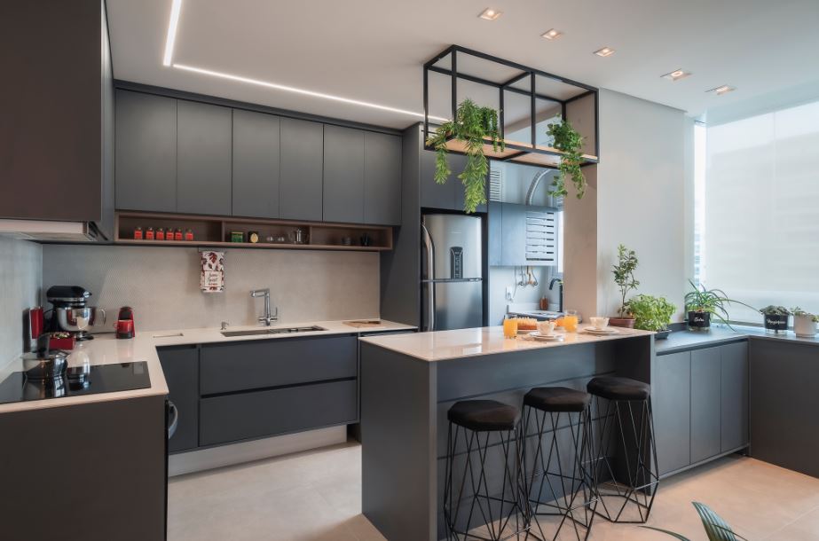 Modernidade é a tônica dessa cozinha idealizada pelo PB Arquitetura. O grafite da marcenaria muito bem explorada se contrapõe a leveza do frontão e piso | Foto: Henrique Ribeiro
