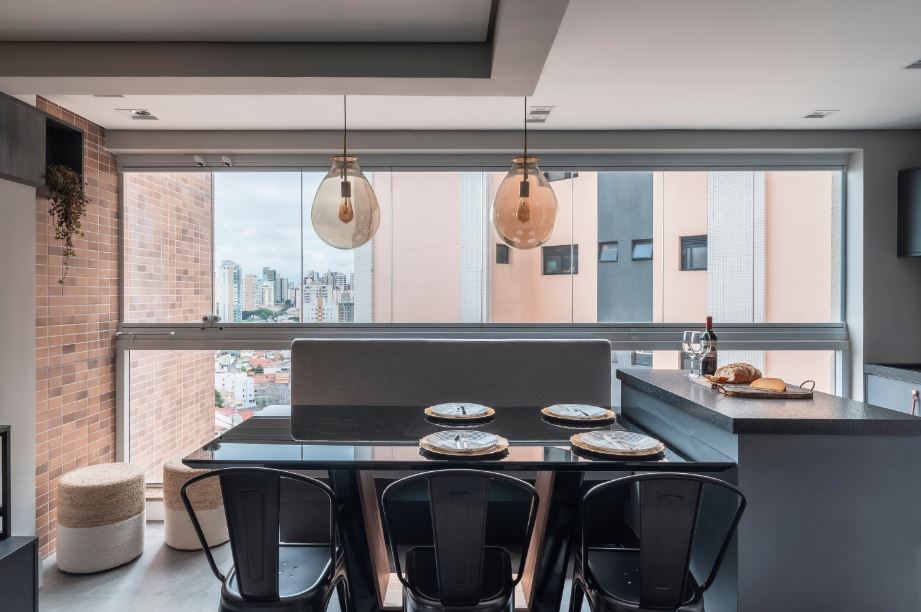 Na sala de jantar com base neutra, a leveza cortina cinza destaca a estrutura de vidro que promove abundante iluminação natural ao espaço | Projeto PB Arquitetura | Foto: Henrique Ribeiro