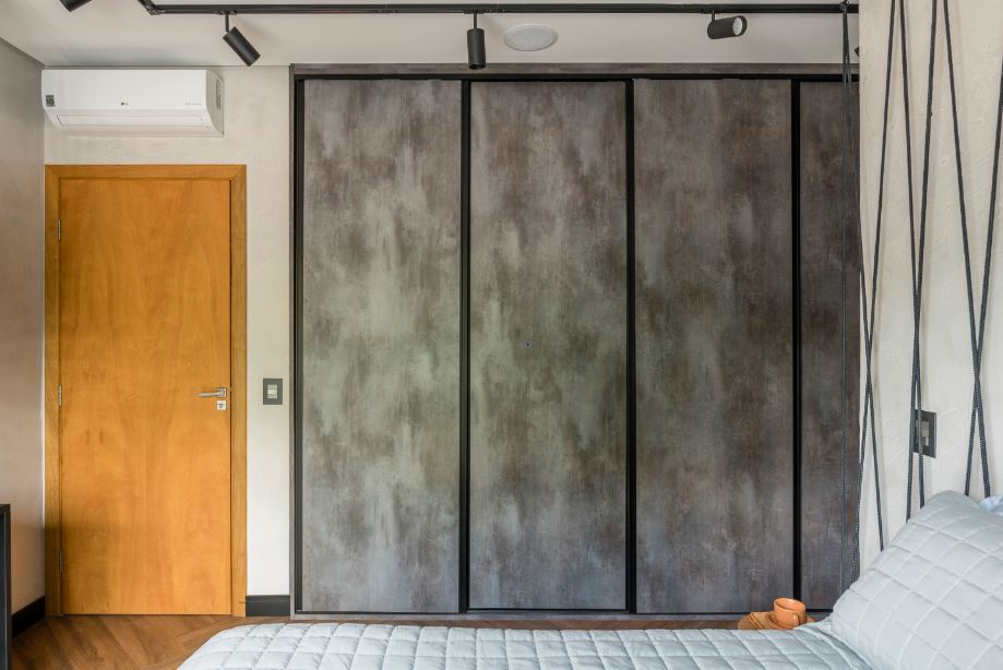 Com ares arrojados, o cinza revela-se a base do projeto realizado pela dupla de arquitetos Priscila e Bernardo. Com uma nuance mais clara nas paredes, o acabamento cinza da marcenaria do armário remete ao aspecto de cimento queimado. Envolvido com a serralheria preta, o armário faz uma referência direta ao décor industrial | Foto: Henrique Ribeiro