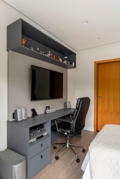 Ao envolver o painel da TV e a marcenaria do home office, a estrutura para as atividades profissionais em casa e o nicho aberto para os objetos decorativos evoca o cinza eleito por Bernardo e Priscila para o dormitório do morador | Foto: Henrique Ribeiro
