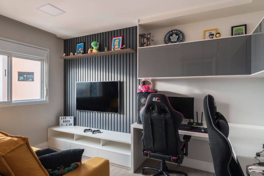 Com dupla função, o ambiente revela o cinza no painel ripado que recebe a TV do lado do home theater e na marcenaria dos armários superiores que acompanha a estrutura do home office do casal de moradores | Projeto PB Arquitetura | Foto: Henrique Ribeiro