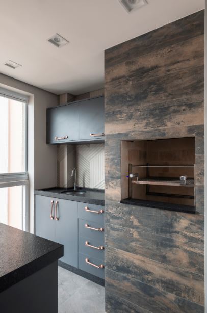 Na varanda gourmet, o cinza se destaca na bancada e na marcenaria posicionada ao lado da churrasqueira | Projeto: PB Arquitetura | Foto: Henrique Ribeiro