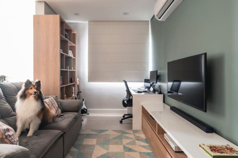 Com dupla função, o ambiente revela o cinza no painel ripado que recebe a TV do lado do home theater e na marcenaria dos armários superiores que acompanha a estrutura do home office do casal de moradores | Projeto PB Arquitetura | Foto: Henrique Ribeiro