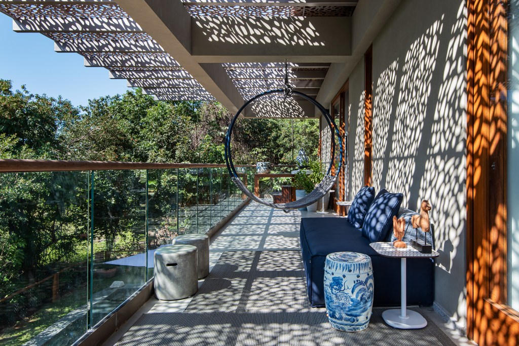 No segundo andar, a varanda traz leveza em forma de espaços de descanso. Uma banheira de hidromassagem compõe a decoração junto com o balanço Pêndulo Ruy Ohtake, módulos e puff Soft, mesa de apoio Bora Bora e Wave, aparador Fusion e vasos revestidos em cordas náuticas.