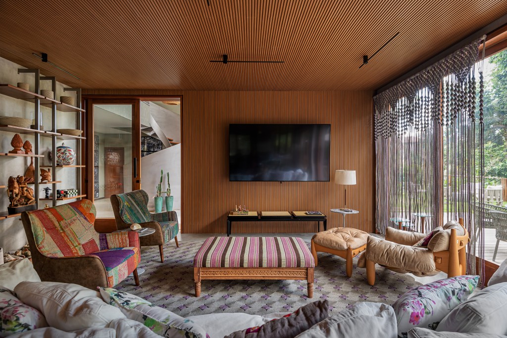 Destaque também para o pergolado criado com painéis em Fórmica TS – material que a Tidelli trouxe de forma pioneira para o Brasil. Com recortes vazados, eles promovem um efeito de luz e sombra e dão vida a movimentos orgânicos a partir da posição solar.