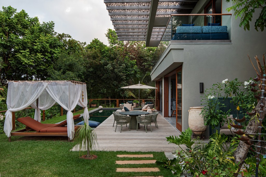 Em frente ao deck, as espreguiçadeiras Fusion de duplo reclino ganharam estrutura e dossel e madeira, com cortinas em voal nas laterais. Na lateral, um banco com biombo de espaldar alto da linha Veracruz confere charme a ambientação externa.