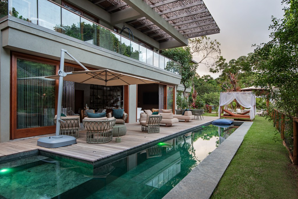 Construído como uma extensão alongada do telhado do segundo andar, o pergolado oferece proteção ao deck da área externa, em frente à piscina – que recebeu almofada flutuante.