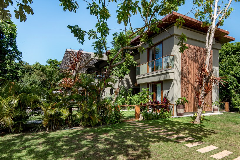 O arquiteto Eliezer Ferreira trabalhou com uma paleta de cores em tons de azul, verde e nudes, como o areia, para o mobiliário. O objetivo foi criar uma residência de descanso para a família, com cores relaxantes e muito aconchego. “Nosso resultado final é uma casa com vida, da estrutura aos móveis, da natureza exuberante aos animais. É a casa da preguiça, do respiro, da convivência. É um lar”, finaliza o arquiteto.