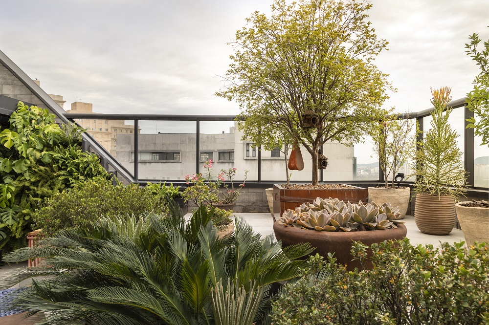 O paisagismo veio para dar leveza e proporcionar o encontro com a natureza neste projeto nas alturas, promovido em uma cobertura de Alto de Pinheiros. Desde a jabuticabeira no centro, até as bacias com suculentas, todos os aspectos foram pensados para abraçar o morador | Foto: Evelyn Müller