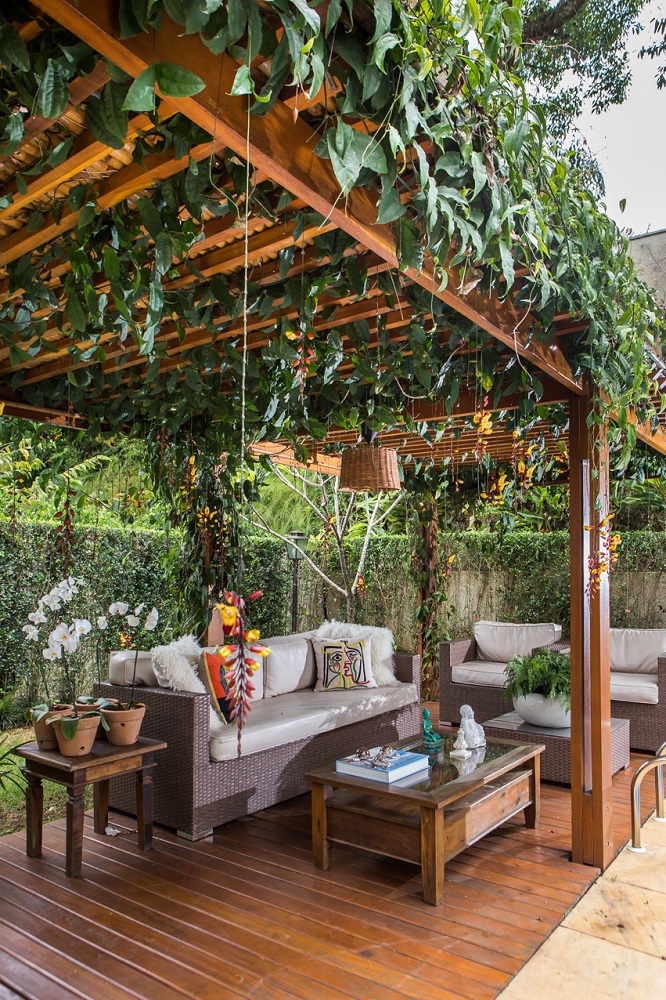 Charmosos e perfeitos para o desenvolvimento de trepadeiras, os pergolados são estruturas bastante interessantes para as áreas externas. Segundo Luciano, a madeira cumaru e o bambu tratado são alguns dos melhores materiais para usar na construção, que é ótima para proporcionar uma sombrinha fresca nos dias mais quentes.