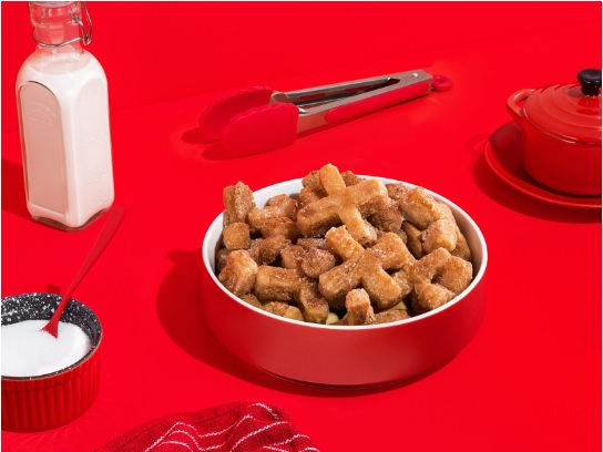 8- Num pote separado, combine o açúcar com o pó de canela e cubra os pedacinhos com essa mistura. Sirva mornos.