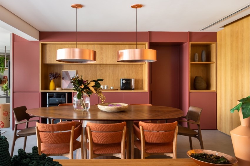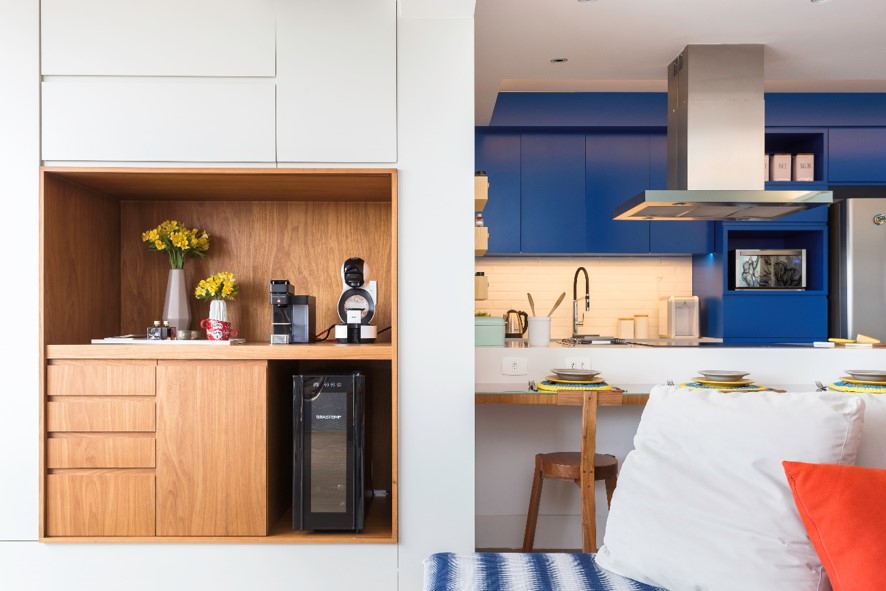 Marcenaria diferenciada para o cantinho: o apartamento com living integrado ganhou uma marcenaria inteligente e colorida, que brinca com os tons rubro e vermelho-queimado. Nesse móvel, o cantinho do café se fez presente, com muito charme. Além disso, o espaço conta com luzes internas, acopladas na marcenaria, deixando o cantinho confortável para uso em qualquer horário. | Projeto: Studio Tan-gram | Foto: Estúdio São Paulo