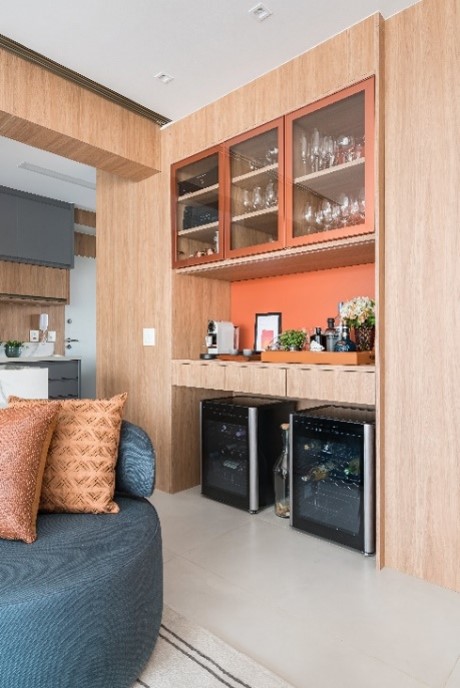 Cantinho do café colorido: Um ambiente completo é o que os moradores deste apartamento podem usufruir. O cantinho do café é todo preparado, contando com itens usuais para deixar o momento ainda mais prático; como o porta-cápsulas. Além disso, ao lado da máquina de café estão bebidas, frigobar e um armário superior com diversos tipos de copos. Tudo isso é completo com sofás coloridos que decoram a sala de estar e onde o café pode ser degustado com muito conforto. Outro triunfo do cantinho é apostar na cor laranja para destacá-lo ainda mais. | Projeto: Spaço Interior | Foto: Kadu Lopes