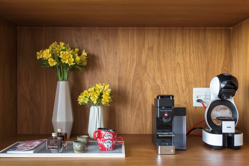 As profissionais orientam que 60cm é um bom tamanho para a bancada do cantinho do café. “Com essa metragem, é possível adicionar outros equipamentos embaixo, como uma adega, além de marcenaria, gaveta, armário etc.“, explica a dupla do Studio Tan-gram. Porém, elas advertem que se for uma máquina profissional ou semiprofissional, é preciso analisar se essa profundidade e qual a infraestrutura que ela exige para atender e deixar tudo preparado | Projeto Tan-gram | Foto: Estúdio São Paulo