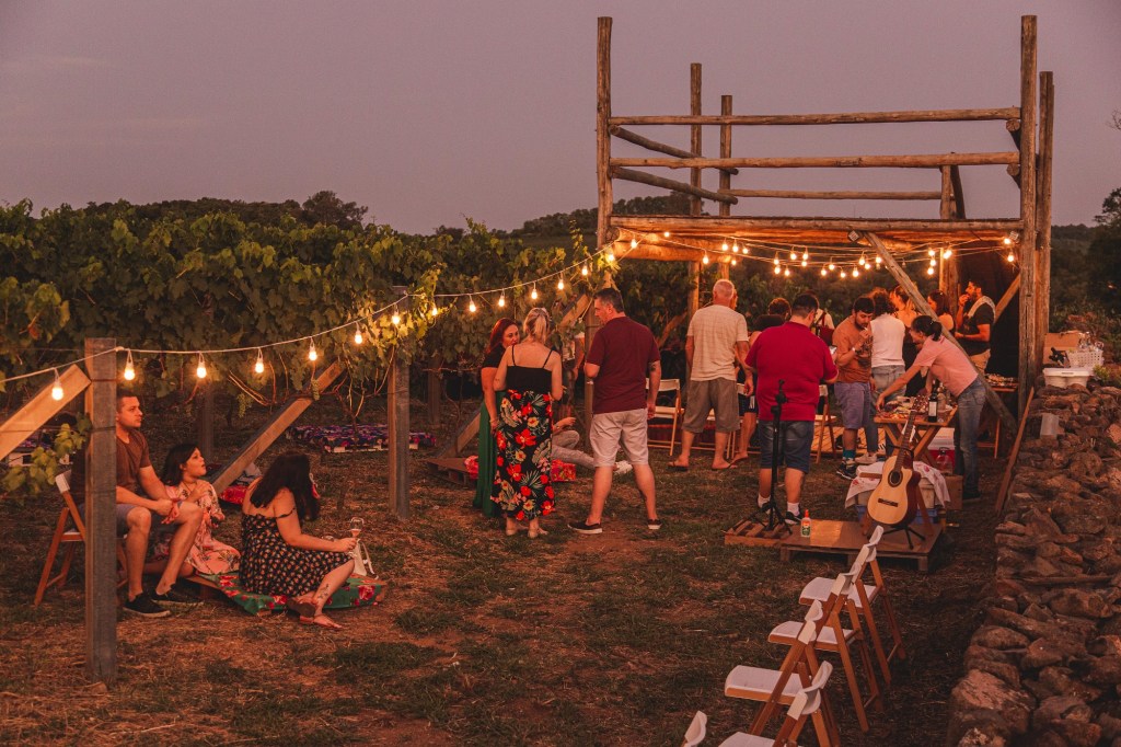 Brunch noturno servido no vinhedo com menu de pães, frios e queijos regionais, frutos secos, frutas frescas, salada de folhas, ragu de ossobuco com polenta mole. Para adoçar, mousse de iogurte natural com calda de suco de uva.