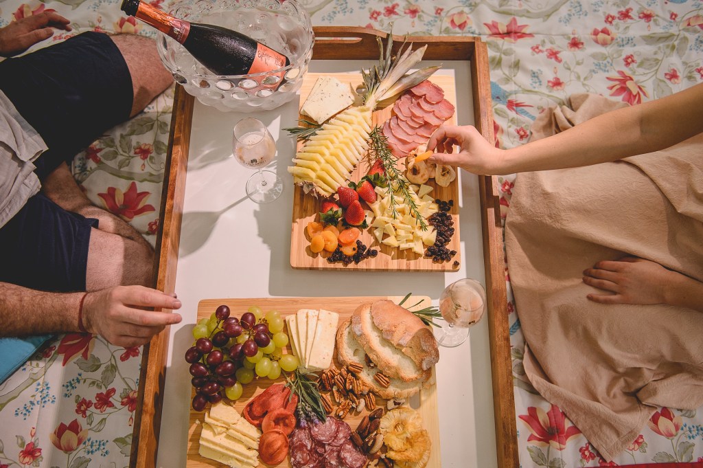 Menu: Uma garrafa de vinho ou espumante a cada duas pessoas, além de duas tábuas com frios, brusquetas de tomate, pão e focaccia, azeite de oliva gaúcho, queijos regionais, culatello e salame, frutas frescas e frutas desidratadas, damascos e azeitonas, espetinho caprese, amêndoas, amendoins, castanha do Pará, castanha de caju e noz pecã, geleias de uva e figo.