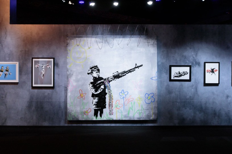 The Art of Banksy “Without Limits” terá uma área reservada à Guerra na Ucrânia mostrando artes anti-guerra que o artista registrou em diferentes cidades do país.