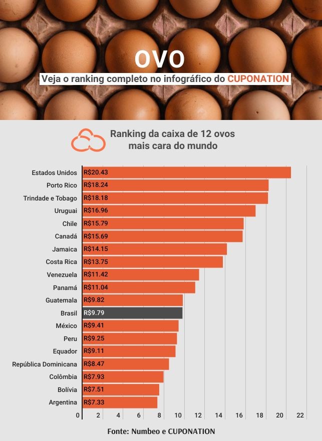 O ranking com os 19 territórios que cobram mais caro pelo ovo têm os Estados Unidos na primeira colocação, em que a população precisa desembolsar cerca de R$20.43 pela mesma quantidade. Porto Rico e Trindade e Tobago seguem na segunda e terceira posição, enquanto a Argentina garante o último lugar só por cobrar pouco mais de R$7.