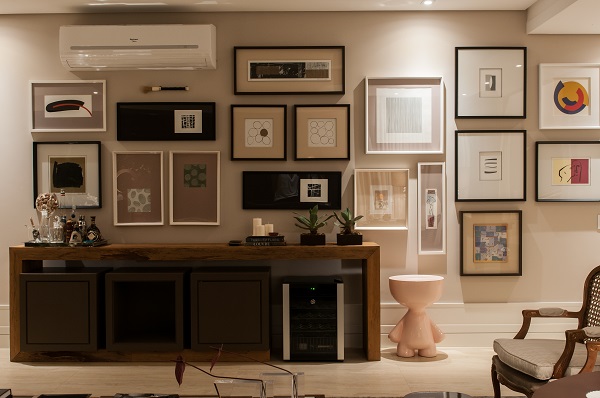 Exemplo que ilustra as muitas possibilidades da gallery wall: aqui, a parede atrás da adega foi eleita para receber uma ampla coleção. Os quadros se conectam bem, a partir do Paspatur e das molduras trabalhadas em tons de branco, preto e bege. Atenção especial ao pincel, que orna a estrutura por si só | Projeto: Paiva e Passarini – Arquitetura | Foto: Xavier Neto