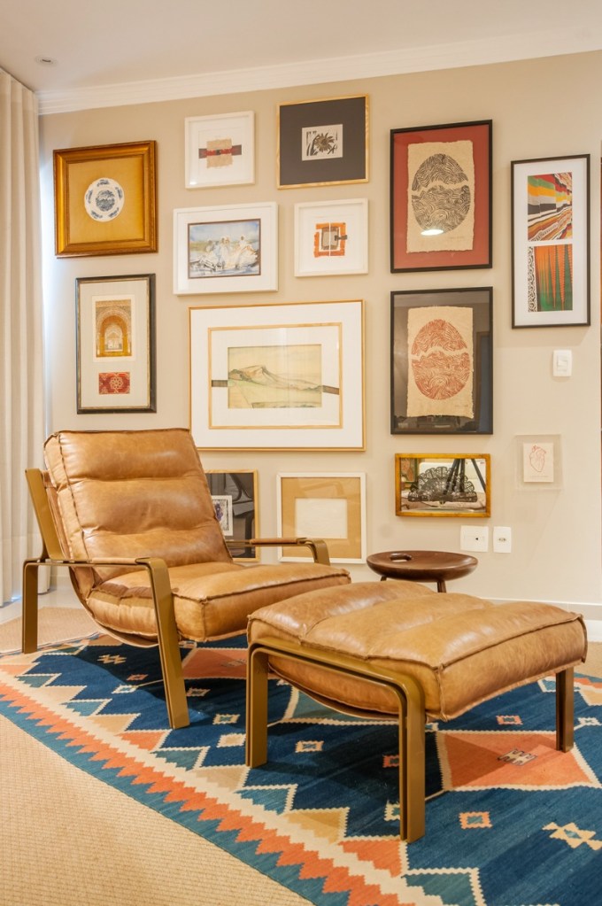 Capa: No projeto realizado pelas profissionais do escritório Paiva e Passarini – Arquitetura, a parede em tijolo de demolição recebeu ampla galeria com molduras do mesmo estilo, apostando em uma estratégia geométrica, Paspatur padronizado e cores mais neutras para equilibrar com o décor do restante do ambiente, rico em estampas e texturas | Foto : Rubens Cardia Neto