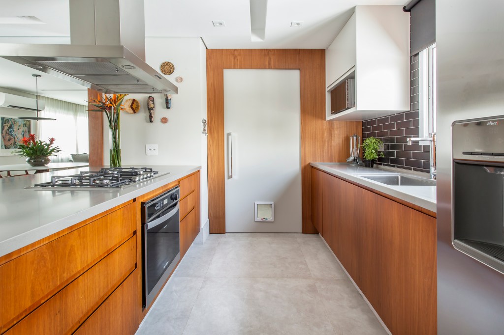 Nesta casa com projeto da Macedo e Covolo Arquitetura, o forno foi instalado sob o cooktop, simulando um fogão de embutir | Foto: Eduardo Pozella