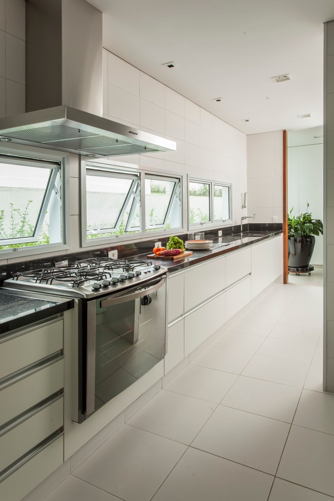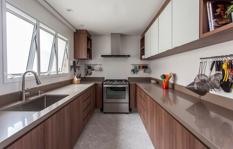 Espaçosa, a cozinha projetada pela Macedo e Covolo Arquitetura ganhou layout em “L”, o que garantiu uma bancada com maior superfície de apoio e lugar estratégico para o cooktop | Foto: Evelyn Muller