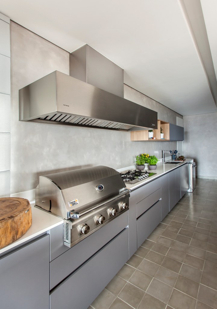 Neste apartamento reformado pela Macedo e Covolo Arquitetura, o cooktop fica ao lado da churrasqueira e, para eles, foi executada uma coifa única sob medida | Foto: Eduardo Pozella