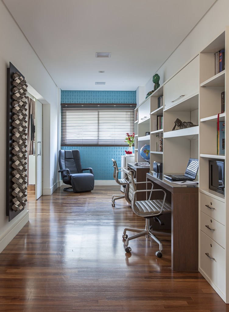 A arquiteta Cristiane Schiavoni enumera as três principais características de um home office: praticidade, conforto e ergonomia. Bem-estar é mandatório: a rigor, ela sempre avalia a altura dos moradores, contudo, pode-se considerar uma mesa de trabalho com 75 cm de altura até o chão e cadeira com ajustes (incluindo angulação na lombar, do braço e do assento). “Em médio e longo prazo, deixar de lado esses parâmetros interfere diretamente em nossa saúde, que não podemos deixar em segundo plano”, detalha.