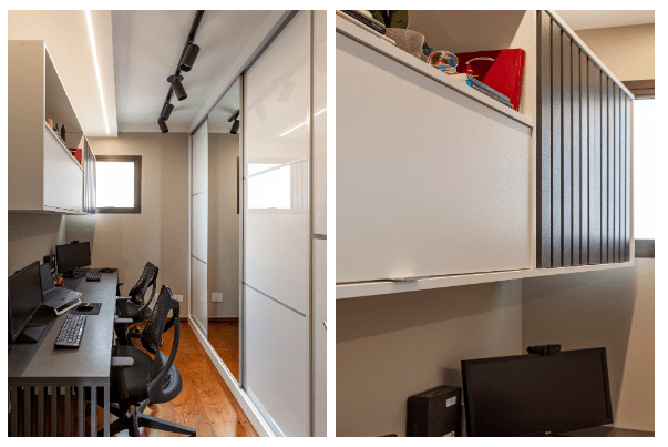 Ainda sobre os dormitórios, a organização é um ponto primordial que ambos precisam seguir. “Quando acontece esse descuido, cumprir as tarefas pode ser tornar uma missão caótica, assim como quando o intuito for o de descansar. Além do espaço para sentar e utilizar o notebook, não abro mão de dispor de gaveteiros e armário para que os dois possam guardar seus materiais. A ideia é sempre a de separar os momentos de trabalho e relaxamento“, orienta Cristiane.