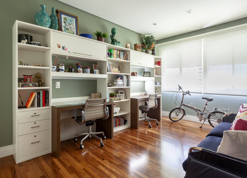 Ainda sobre os dormitórios, a organização é um ponto primordial que ambos precisam seguir. “Quando acontece esse descuido, cumprir as tarefas pode ser tornar uma missão caótica, assim como quando o intuito for o de descansar. Além do espaço para sentar e utilizar o notebook, não abro mão de dispor de gaveteiros e armário para que os dois possam guardar seus materiais. A ideia é sempre a de separar os momentos de trabalho e relaxamento“, orienta Cristiane.