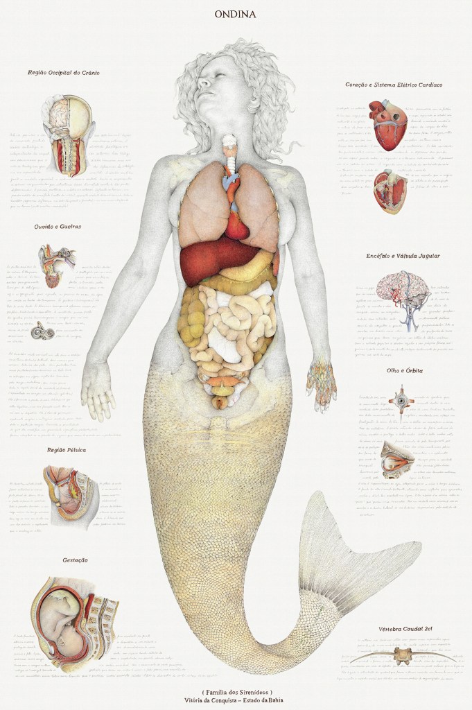O mesmo esquema representativo foi usado para a figura da Sereia – uma versão fantástica que lembra os estudos de anatomia do inventor italiano Leonardo Da Vinci (1452-1519), outra referência sua.