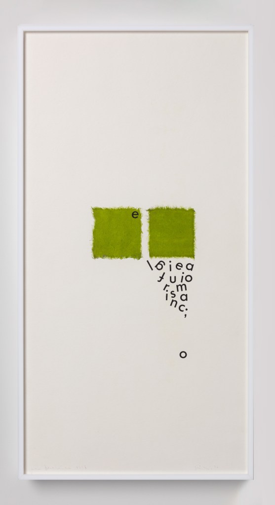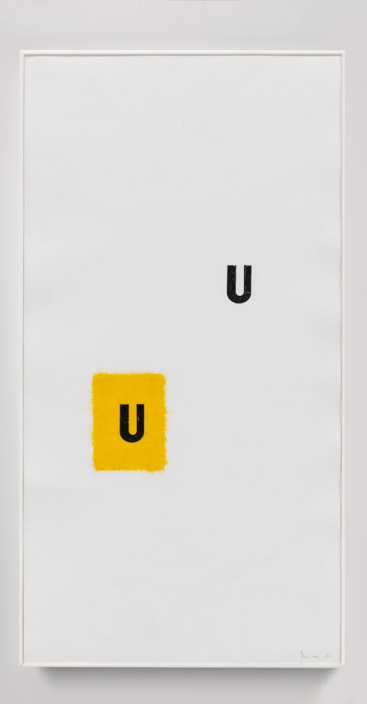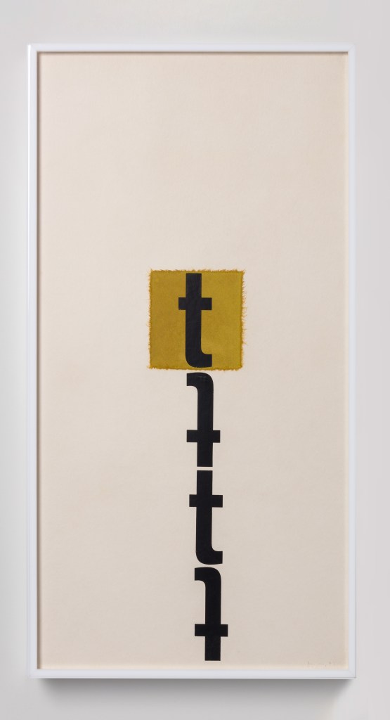 Mira Schendel: Toquinhos apresenta trabalhos em que a artista cria camadas colando sobre o papel japonês recortes geométricos (tingidos ou não) do mesmo papel, normalmente acompanhados de sinais de pontuação e letras. Ao ser questionada, em 1975, pela jornalista Norma Couri: “Por que letras?”, Mira responde: “São o pré-texto ou o pretexto do pós-texto”. Comentando tal diálogo, o teórico Geraldo Souza Dias afirma, em sua monografia sobre a artista intitulada Mira Schendel: do espiritual à corporeidade (2009): “A completa redução da forma a círculos e retas, desenvolvida nos tipos sem serifa da fonte Futura, a preferida da artista, permite considerar a relevância ótica das letras enquanto elementos de um conjunto. Nos trabalhos de Mira, o significado original dos sinais caligráficos – letras e números – transforma-se pela ação da letra autocolante, assumindo um caráter novo, puramente plástico.”