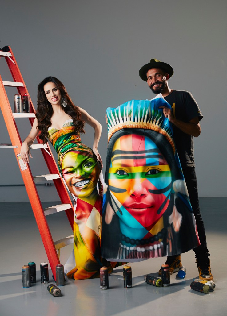 Em uma “tela branca” em formato de vestido, criado pelo estilista Bruno Oliveira, o muralista retrata a diversidade étnica com uma mulher preta e outra representante dos povos originários (frente e verso da peça). “A ideia surgiu da minha admiração pelo Kobra e pela conexão que temos por meio da sustentabilidade. Ele topou na hora, tamanha sua generosidade e entendimento sobre a importância feminina na sociedade. Contamos, no vestido, o que tenho perpetuado em meu reinado: a consciência de que estamos muito além da beleza física. Estou ansiosa para ver como o público vai reagir”, diz Mia sobre a parceria com o reconhecido artista.