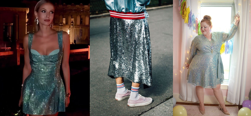 Glitter, lantejoulas, paetês e superfícies brilhantes são ótimas para te ajudar a explorar o Barbiecore para além do universo dos rosados. Pode funcionar, em especial, de forma bem moderna junto com o preto. Alô, Barbie Góticas, essa é pra vocês!