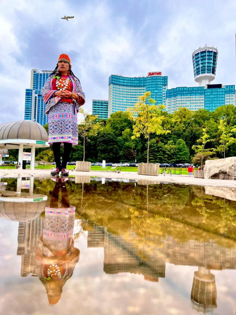 Olinda Silvano Inuma, peruana de 55 anos, é uma artista, tecelã e muralista amazônica. Com uma trajetória de mais de 30 anos e reconhecimento internacional, Olinda é uma das lideranças do povo Shipibo e através da arte kené, caracterizada pelas linhas geométricas, ela tem conseguido preservar o saber ancestral de seu povo originário, que é localizado na comunidade de Cantagallo em Lima.
