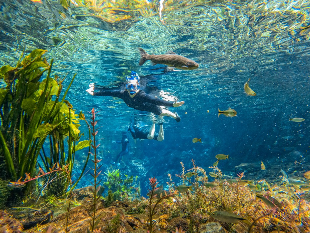 Em meio a águas cristalinas, cardumes de peixes e um verdadeiro jardim subaquático, ela acontece no rio homônimo, cuja correnteza é quase imperceptível – até quem não sabe nadar pode participar, com toda a segurança.