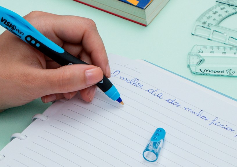 Entre os destaques da Maped estão a caneta esferográfica, com sua extremidade curvada para facilitar a visão e a escrita de quem usa a mão esquerda, as tesouras totalmente projetadas com lâminas invertidas, além de réguas e apontador adaptáveis para essas pessoas.
