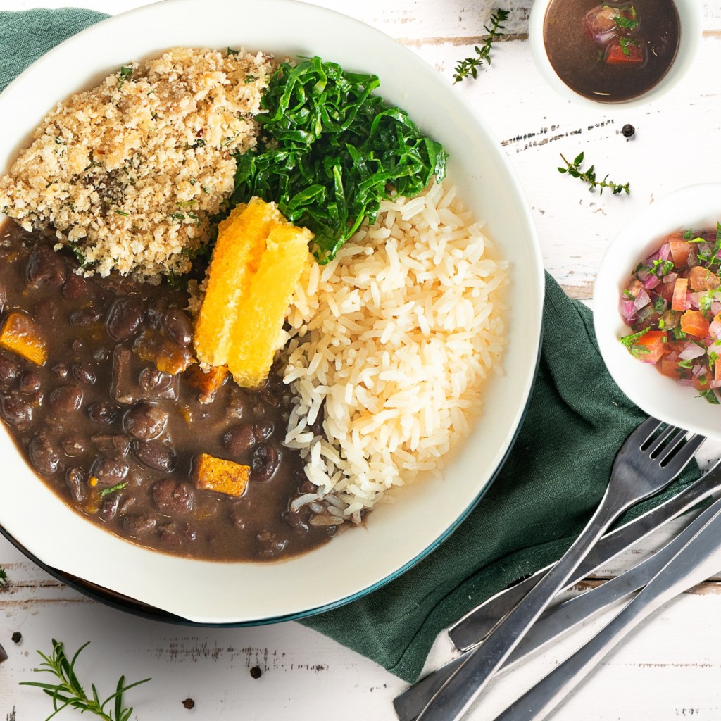 A feijoada do Purana é bem temperada, reforçada com abobrinha, abóbora, cogumelos, tofu defumado, couve refogada, farofa de banana especial da casa, molho de pimenta e vinagrete.