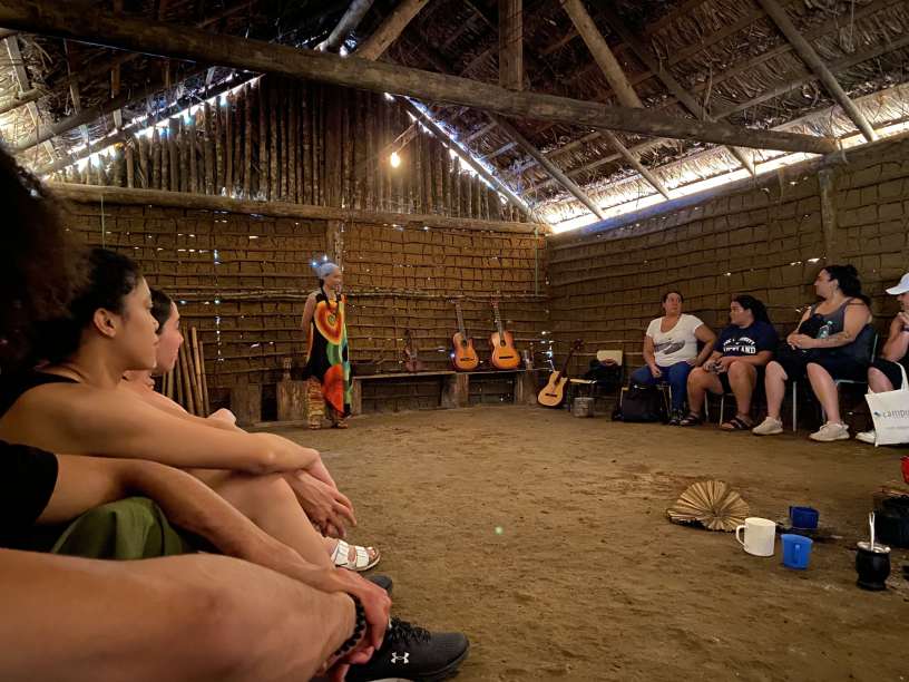 Expedição de turismo sustentável na Terra Indígena Tenondé Porã (SP) – Imersão cultural com um momento de doação de calcinhas absorventes sustentáveis e roda de conversa sobre saúde menstrual para pessoas indígenas que menstruam.