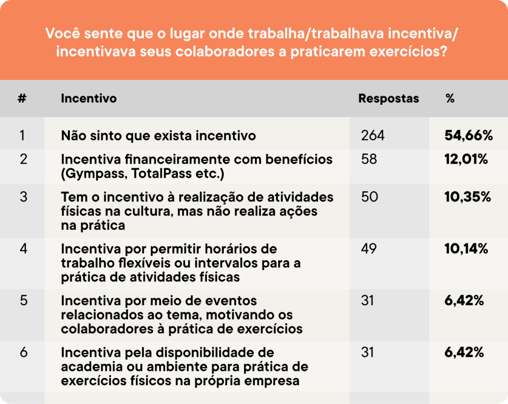 Acerca do assunto, 55% dos entrevistados disseram não sentir que exista incentivo a prática de esportes dentro das empresas onde atuam. Para os demais respondentes, os incentivos percebidos são, principalmente, por meio da oferta de benefícios corporativos, como Gympass e TotalPass, indicado por 12% dos perguntados; incentivo ao permitir horários de trabalho flexíveis ou intervalos para a prática de atividades físicas, citado por 10%; estímulo pela disponibilidade de academia ou de ambientes próprios para a prática de exercícios no próprio ambiente de trabalho, apontado por 6%, e o encorajamento por meio de eventos relacionados ao tema, também escolhido por 6% dos entrevistados. Ainda, 10% dos respondentes relata que percebe o incentivo na cultura da empresa, mas que essas não realizam ações na prática.