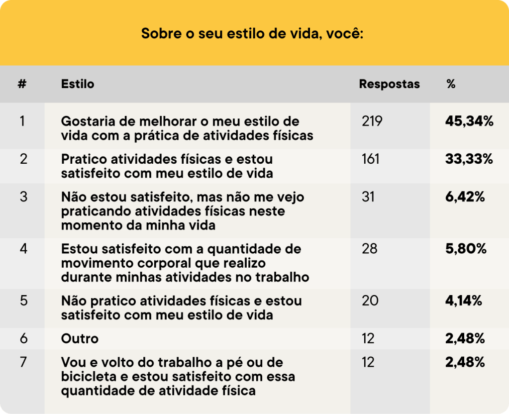 Mesmo com os diversos gostos pessoais, é importante que todos estejam cientes de suas escolhas e de como elas podem impactar suas vidas ao longo dos anos, e por isso a difusão das informações sobre o assunto é tão importante. Sobre a satisfação com o estilo de vida atual, 45% dos entrevistados disseram que gostariam de melhorar seu estilo de vida com a prática de atividades físicas e 33% praticam atividades físicas e estão satisfeitos com seu estilo de vida.