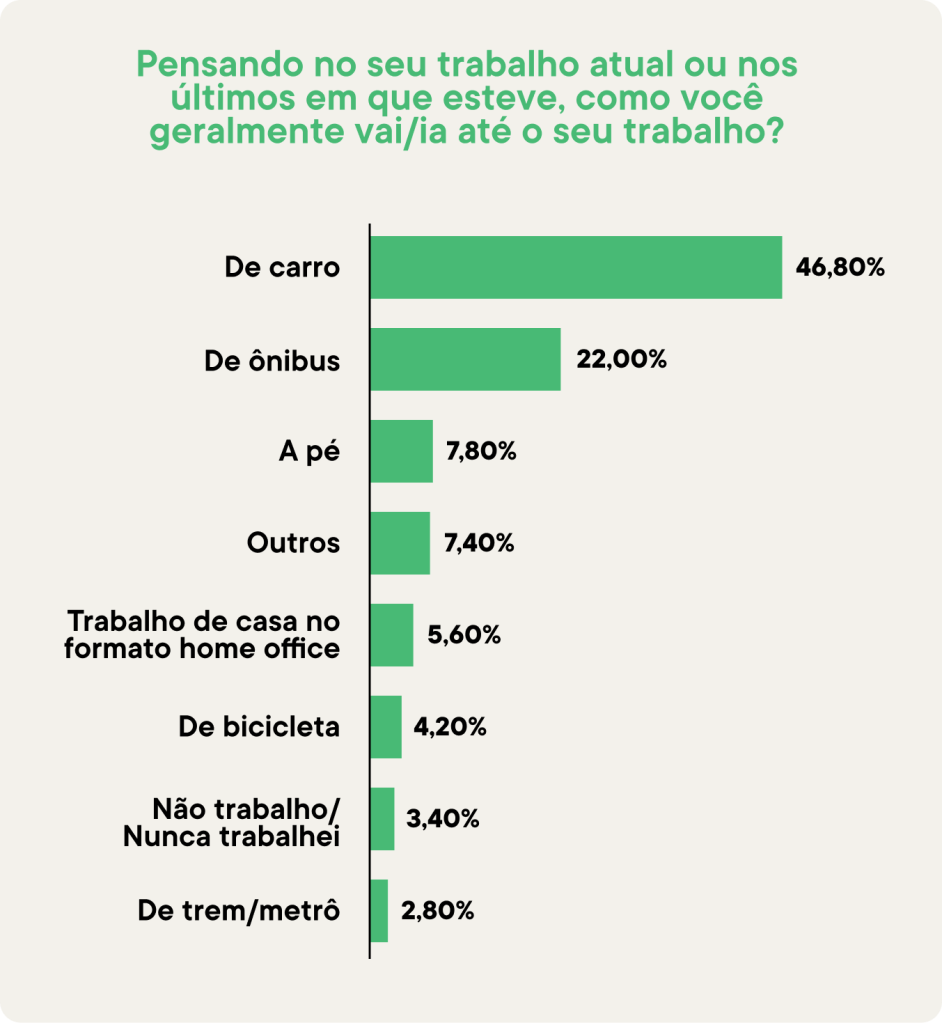 Algo que potencialmente poderia minimizar a falta de atividades ao longo do período de trabalho seria a forma como se vai até ele. Porém, o que geralmente se vê nas cidades são grandes distâncias entre os bairros e vias, pensadas exclusivamente para os veículos, causando insegurança para os pedestres. Neste panorama, 47% dos entrevistados disseram que normalmente vão até o trabalho de carro; 22% utilizam ônibus e 3% trem ou metrô. Somente 8% responderam que se deslocam a pé para o trabalho e 4% utilizam a bicicleta como meio de transporte.