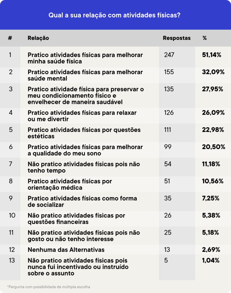 Considerando essa relação pessoal com as atividades físicas, 51% dos entrevistados afirmam realizar exercícios para melhorar sua saúde física; 32% buscam melhorar a saúde mental; 28% procuram melhorar o condicionamento físico para envelhecer de forma mais saudável; 26% praticam para relaxar ou se divertir; 23% se exercitam por questões estéticas, e 20% para melhorar a qualidade do sono. Quem não costuma realizar nenhuma atividade também tem seus motivos, com destaque para a falta de tempo, indicada por 11%; por questões financeiras, para 5%, ou por realmente não gostarem ou não terem interesse, citado por 5% dos perguntados.