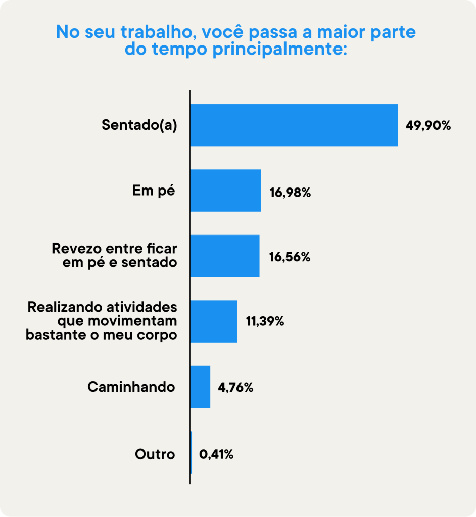 Inicialmente, é importante perceber o quanto as atividades exercidas no trabalho influenciam na movimentação do corpo. No entanto, segundo o estudo, o que se percebe é que a grande maioria dos entrevistados, representando 50% dos respondentes, passa a maior parte do tempo de trabalho sentado. Entre os demais, 17% trabalha principalmente em pé; 17% reveza entre ficar em pé e sentado, e apenas 11% realizam atividades que movimentam bastante o corpo.
