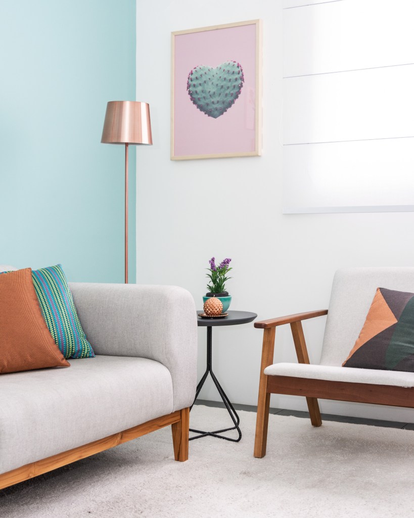A arquiteta Júlia Guadix, do Studio Guadix, apostou no rose gold na luminária de piso, posicionada ao lado do sofá. A escolha ficou em harmonia com o décor composto por candy colors, tons terrosos e a madeira em evidência | Foto: Guilherme Pucci