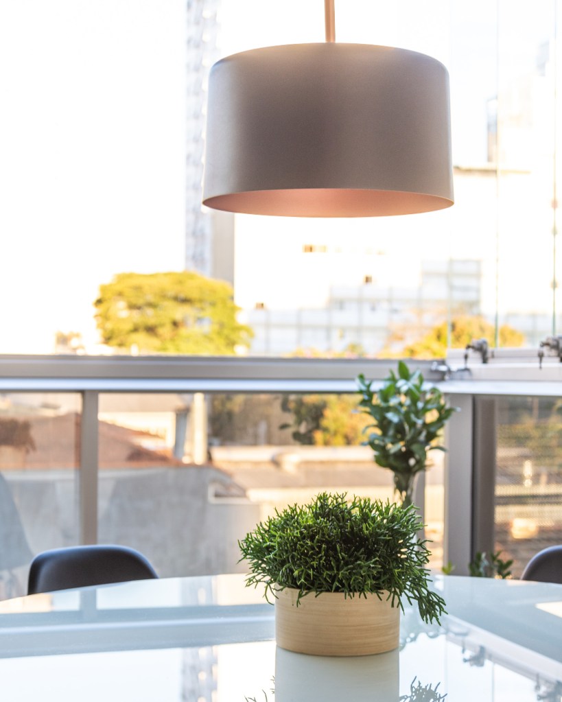 Na sala de jantar, o rose gold marca o pendente, transformando-se em um item decorativo na composição do ambiente | Projeto Studio Guadix| Foto: Guilherme Pucci
