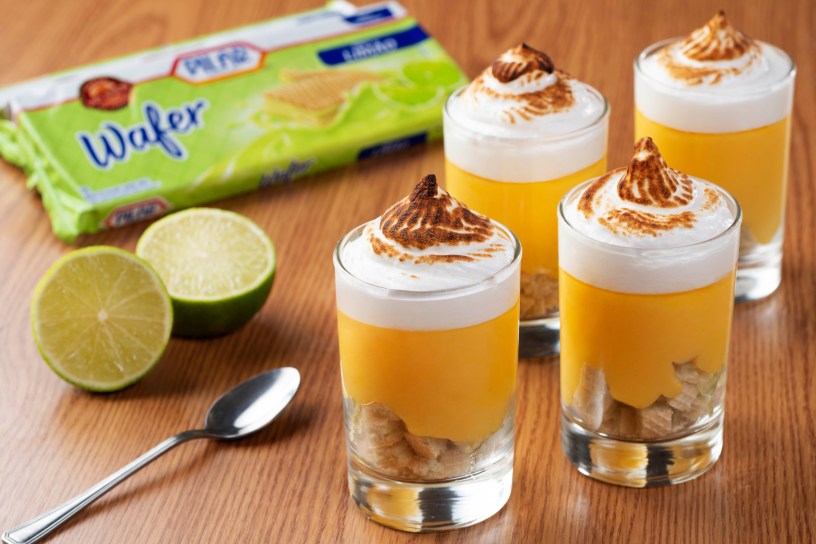 – Coloque em tacinhas a farofa de Biscoito Wafer Pilar Limão e em seguida, creme de limão;