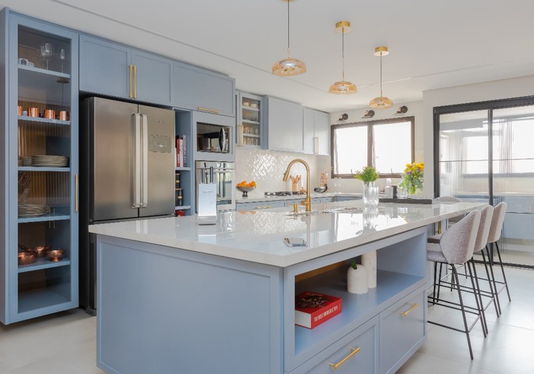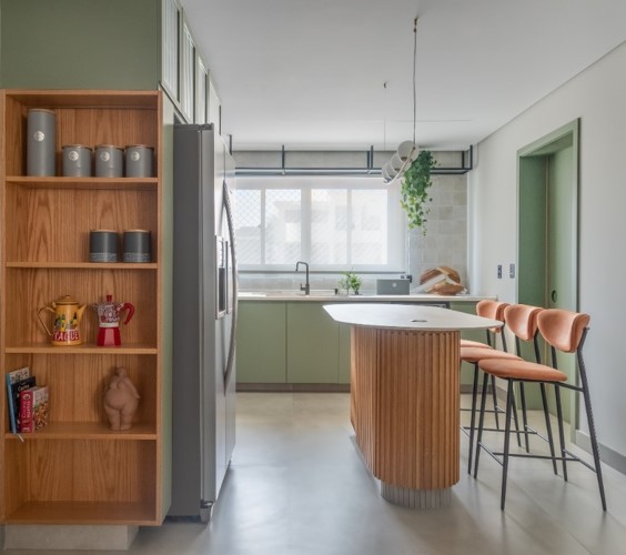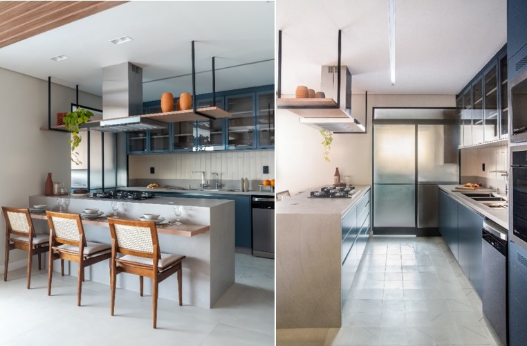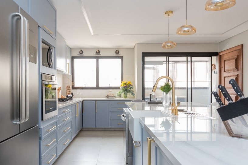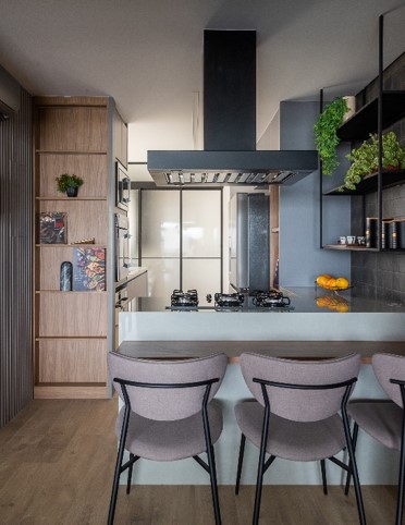 O ponto de partida é definir a opção que irá compartimentar a cozinha e área de serviço, que pode ser feita em serralheria e fechamento de vidro e madeira, por exemplo, considerando as portas em tipologias que melhor atendam o projeto como as mimetizadas, de correr ou de folhas. Nesse entendimento, a profissional ainda coloca como observação a necessidade de ventilação e luz natural para a área de cocção e preparo dos alimentos. “Caso esses fatores estejam dispostos apenas na área de serviço, precisamos pensar em alternativas que ofereçam esses atributos também para a cozinha”, indica.